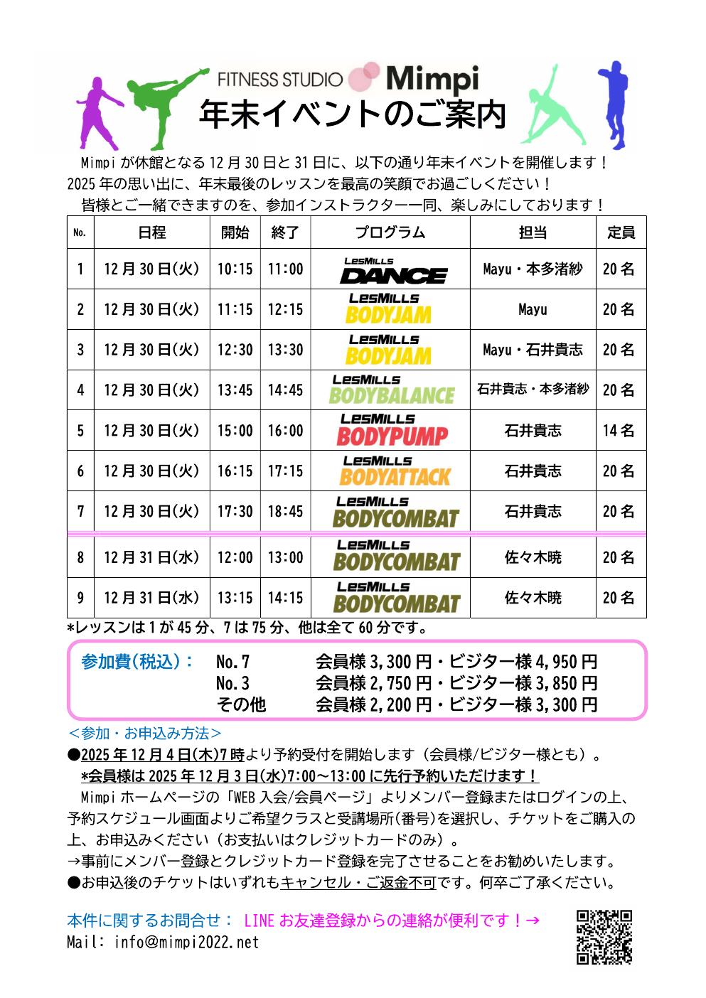 今年もMimpiは大晦日までクラスを実施します! 2025年を悔いのないものにするため、目一杯動いて楽しみましょう! 皆様のご参加をお待ちしております! 会員様は12月3日(水)7:00~13:00先行予約開始! 会員様、ビジター様とも12月4日(木)7:00~予約開始! 各クラスとも混雑が予想されます! 早めのご予約と場所の確保がオススメです。 ご予約はこちらから↓ Mimpi予約スケジュール