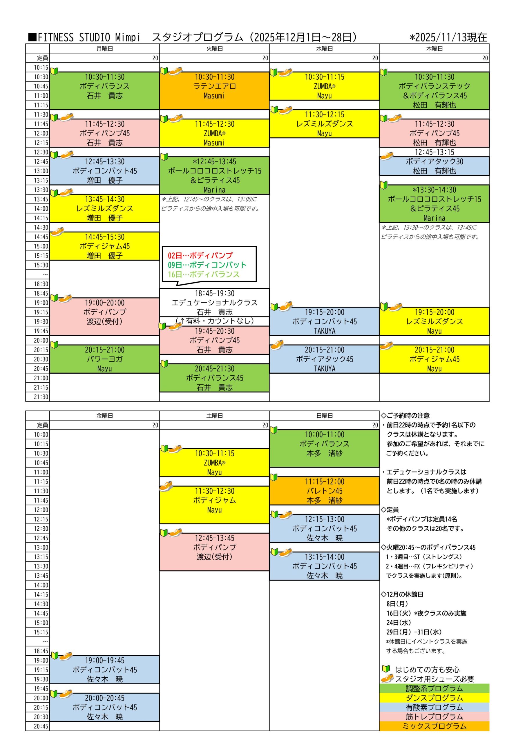 ①火曜日の夜クラスについて、休館となる12/16(火)にレギュラークラスを実施。